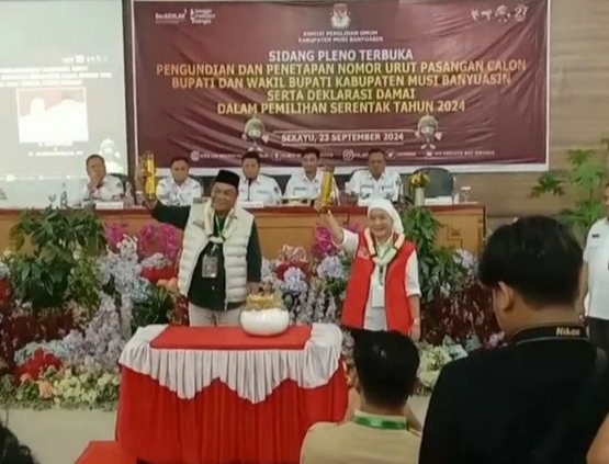 “Ya, KPUD Kabupaten Muba resmi menetapkan nomor urut calon Bupati dan Wakil Bupati Muba, untuk pasangan Lucianty-Safarudin nomor 1 dan pasangan Toha-Rohman nomor urut 2, ” ujar komisioner Pemilihan umum dalam sidang pleno terbuka (*)