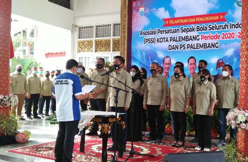 Pelantikan dan Pengukuhan Asosiasi Persatuan Sepak Bola Seluruh Indonesia (PSSI) Kota Palembang periode 2020 – 2024 dan PS Palembang yang di gelar di Rumah Dinas Walikota, Kambang Iwak, Selasa (3/11/2020).