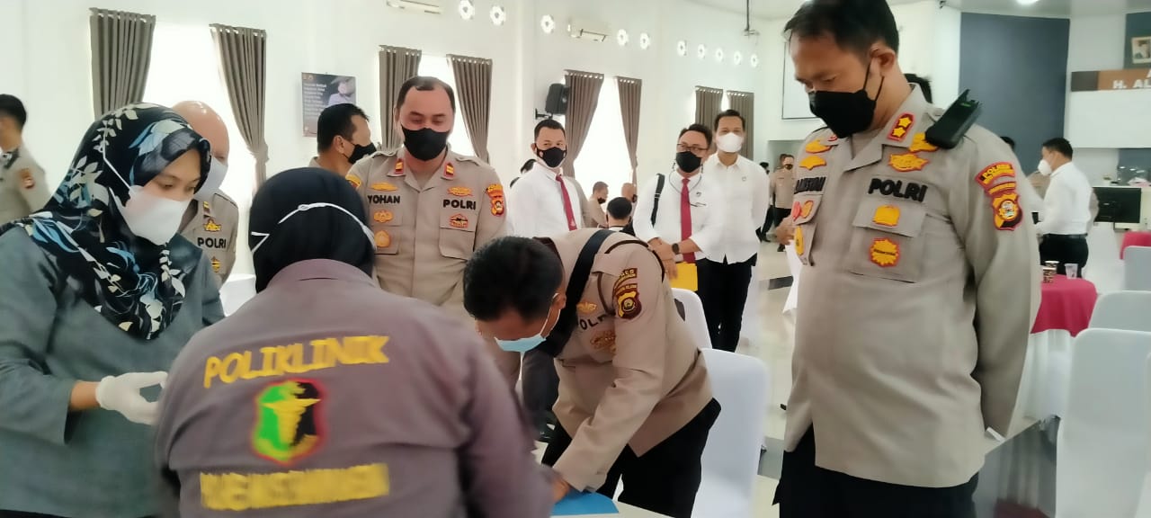 Kapolres Muba AKBP Alamsyah Pelupessy SH SIK MSi melakukan pemeriksaan tes urine kepada seluruh personel Polres Muba.