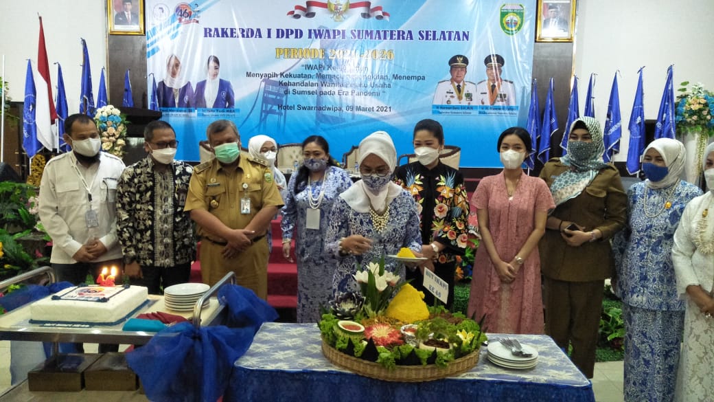 Palembang, The8news.com – Rakerda 1 DPD IWAPI Sumatra Selatan Periode 2021-2026 IWAPI Hut-46 Tahun dengan tema Menyapih Kekuatan Memacu Kebangkitan Menempa Kehandalan Wanita Pelaku Usaha di Sumsel Pada Era Pendemi di Hotel Swarna Dwipa, Selasa (9/3) Palembang.