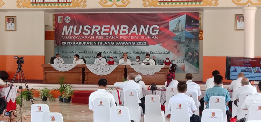 Pada acara Musrenbang tersebut mengusung tema percepatan pemulihan ekonomi dan kesehatan serta peningkatan kualitas sumber daya manusia menuju Tulangbawang aman mandiri dan sejahtera.