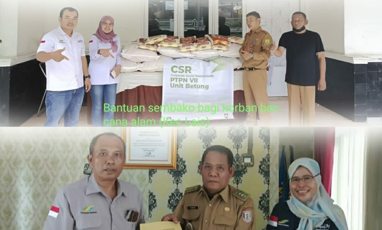 Manager PTPN VII Andri melalui Asisten Umum Unit Betung Wiwin Meliya Santi, Skm mengatakan pemberian bantuan kegiatan keagamaan dan bantuan paket sembako kepada warga yang terkena dampak bencana alam dalam wilayah kecamatan Lais, merupakan bentuk perhatian dan kepedulian Perusahaan terhadap warga desa penyanggah seputar perusahaan.