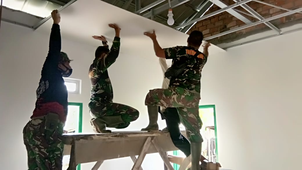 “Plafon sudah selesai dipasang personil. Besok akan dilanjutkan lagi untuk mengerjakan plamir untuk menutup sambungan di plafon,” ujar Dansatgas.