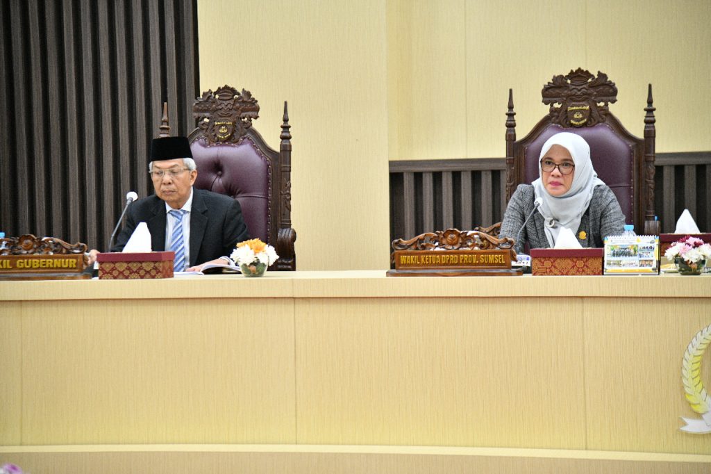 Rapat Paripurna dipimpin oleh Wakil Ketua DPRD Prov. Sumsel; Kartika Sandra Desi, SH dihadiri oleh Wakil Gubernur Prov. Sumsel Ir. H. Mawardi Yahya, Pimpinan OPD dilingkungan Pemerintah Provinsi Sumatera Selatan serta tamu undangan lainnya.