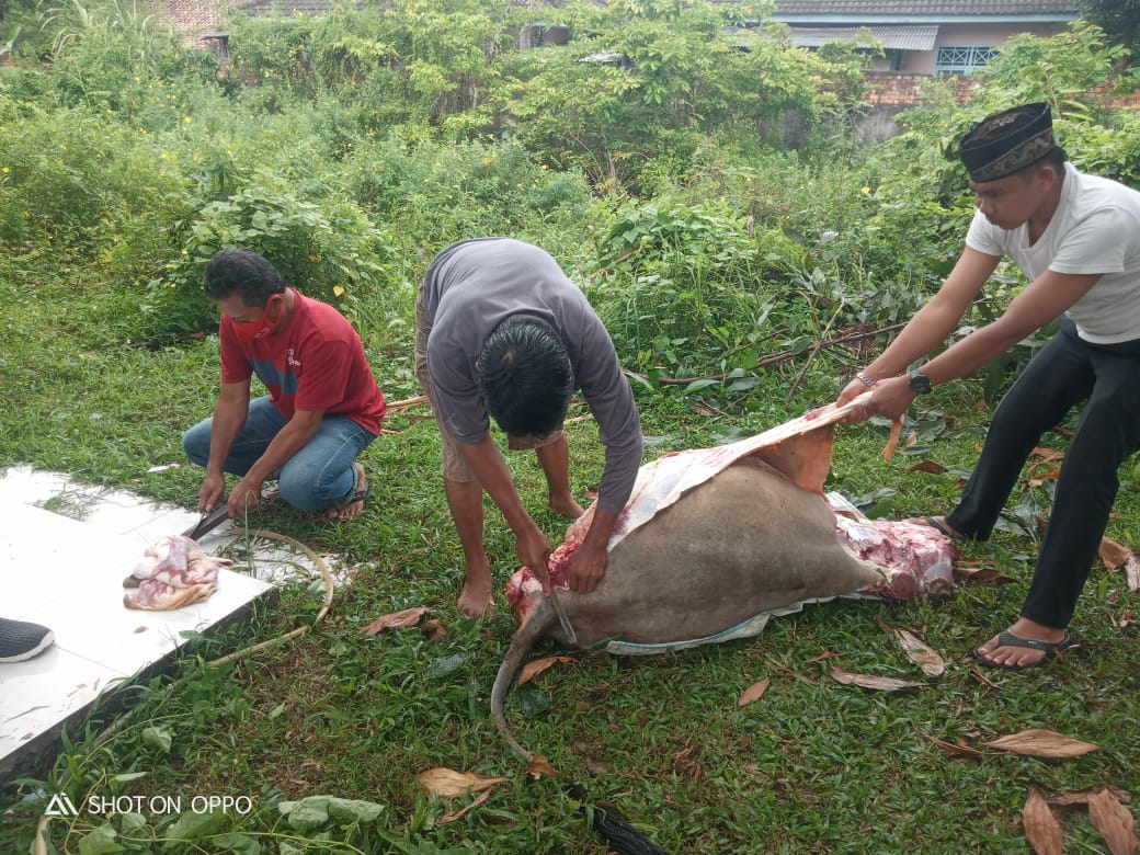 Hewan kurban berupa sapi sebanyak 1 ekor yang berasal dari bantuan Pemerintah Kabupaten Musi Banyuasin itu dipotong langsung di Halaman Kantor PWI Muba, Selasa (20/7).