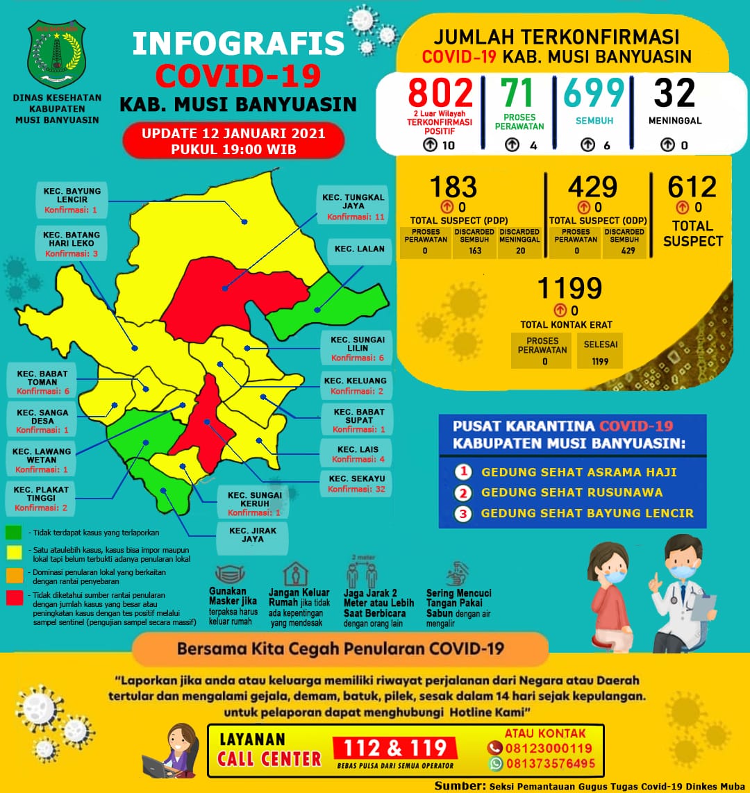 “Ada penambahan 6 kasus sembuh dan 10 terkonfirmasi positif COVID-19 per 12 Januari 2021,” ungkap Jubir Gugus Tugas Penanganan COVID-19 Muba, Seftiani Peratita SS MKes.