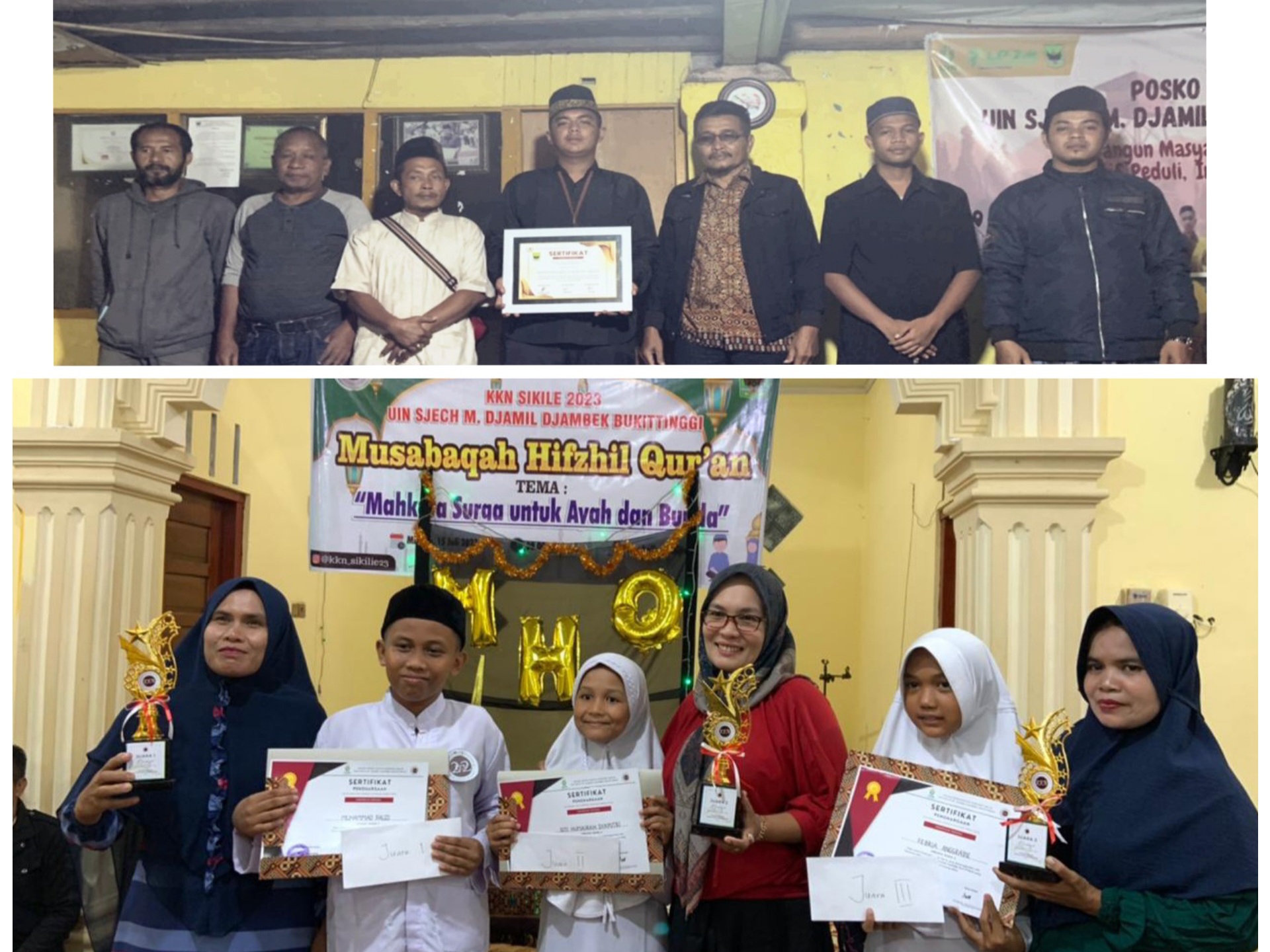 Setelah berjalannya program tahfizh selama 3 minggu, kami melaksanakan musabaqah hifzhil qur’an pada tanggal 16 juli 2023 yang mana pesertanya adalah seluruh santiwan/i yang mengikuti program tahfizh di dua surau tempat program ini kami laksanakan. Musbaqah hifzil quran ini kami mengangkat tema “ Mahkota Syurga Untuk ayah Dan Bunda “karena kami yakin santri yang mengikuti program tahfiz ialah santri pilihan yang akan memberikan mahkota syurga untuk kedua orang tuanya nanti. Acara ini kami angkat dengan iuran dan beberapa sponsor yang telah membantu kami untuk mengangkat acara ini. memang hadiah yang kami berikan tidak begitu mahal dari material namun sangat berarti untuk santri melnjutkan ke sekolah yang lebih tinggi nantinya. Karena salah satu dari hadiahnya sertifikat yang di bubuhi tokoh masyarakt korong sikilie dan bapak wali nagari sekalipun semua peserta kami berikan sertifikat ini. dan selain itu santri juga kami berikan mahkota, karena kami yakin santri yang mengikuti program ini akan memberikan mahkota yang sebenarnya di syurga nanti. Aamiin rabbaral “alamin