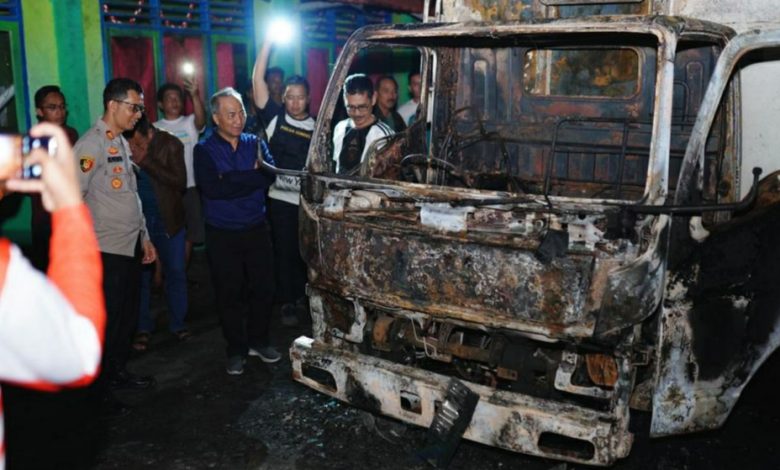 Poto; Pj Bupati Muba bersama kapolres Muba, Kepala BPBD dan Kasat Pol PP Muba saat meninjau kondisi lokasi kebakaran dan Mobil truk yang terbakar di lokasi kejadian di desa Bailangu Timur kec Sekayu kab Muba, Senin (28/8/23)