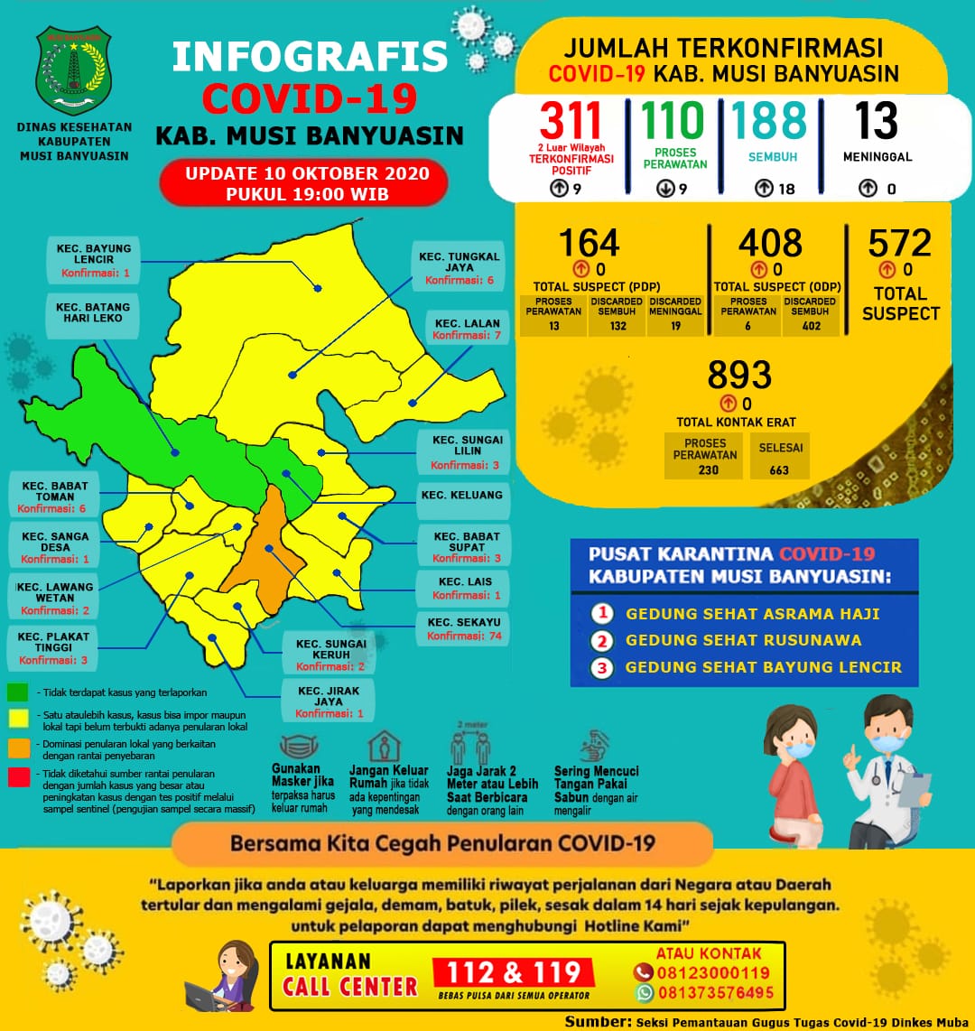 Sefti mencatat hingga 10 Oktober 2020 ada sebanyak 311 kasus terkonfirmasi di Muba. “188 kasus sembuh, 13 meninggal dunia, dan 110 orang masih dirawat,” terangnya.
