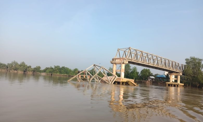 Jembatan penghubung di Desa Suka Jadi P.6 menuju Desa Galih Sari P.11 kecamatan Lalan kabupaten Musi Banyuasin (Muba) ambruk di tabrak tongkang angkutan Batubara, Senin (12/8/2024) tadi malam.