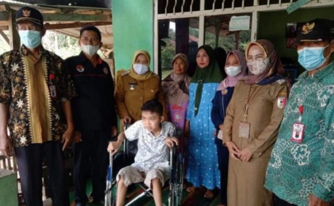 Dinas Sosial Kabupaten Tulang Bawang didampingi Dewan Pengurus Daerah Jaringan Pendamping Kebijakan Pembangunan (DPD JPKP) Tuba menyerahkan bantuan kursi roda kepada penyandang disabilitas anak dari bapak JUMARDI dan Ibu MERIYANTI yang bernama Ridho Marcelino umur 13 th warga Kampung Aji Permai ,Kecamatan Gedung Aji Kabupaten setempat,