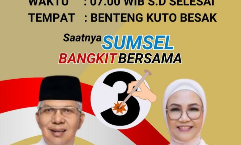 PALEMBANG, The8news.com – Pasangan Calon (Paslon) Gubernur dan wakil Gubernur Sumsel nomor urut 3 Mawardi Yahya-Anita Noeringhati (MATAHATI) menggelar acara senam sehat bersama dengan bertabur doorprize. Acara akan berlangsung di Benteng Kuto Besak (BKB) Palembang pada 12 Oktober 2024, Pukul 07:00 WIB s/d Selesai.