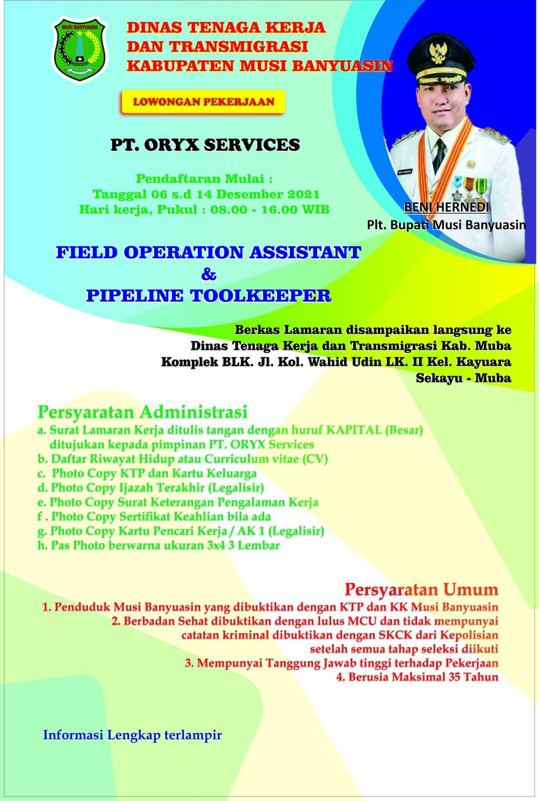 Sementara PT. ORYX Services yang merupakan salah satu Kontraktor ConocoPhillips (Grissik) Ltd, membuka kesempatan kerja untuk tenaga kerja terampil/skill bidang Industri Migas.