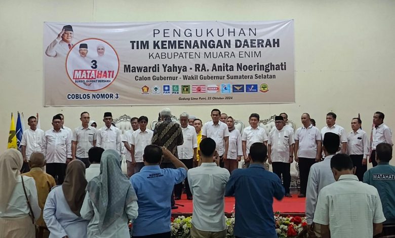 Muara Enim, The8news.com – Tim kemenangan daerah (TKD) Calon Gubernur dan Wakil Gubernur Sumatera Selatan (Sumsel) nomor urut 03, H. Mawardi Yahya dan Hj RA Anita Noeringhati (MataHati) di Kabupaten Muaraenim akhirnya resmi dilantik, Selasa (22/10/2024).