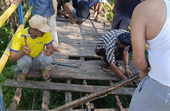 Dengan alat dan bahan sederhana, warga memperbaiki bagian jembatan yang rusak demi kelancaran akses dan keamanan. Aksi gotong royong ini menjadi wujud nyata kepedulian dan kekompakan masyarakat dalam menghadapi keterbatasan.