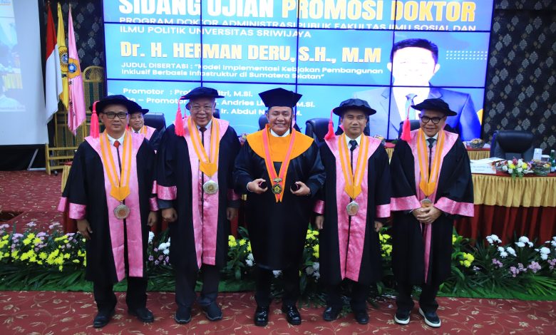 Palembang, The8news.com – Gubernur Sumatera Selatan (Sumsel), H. Herman Deru, resmi menyandang gelar akademik doktor usai menjalani Sidang Terbuka Promosi Doktor di Universitas Sriwijaya, Palembang, Senin (30/6/2025). Dalam sidang tersebut, Herman Deru memaparkan disertasi berjudul “Model Implementasi Kebijakan Pembangunan Inklusif Berbasis Infrastruktur di Sumatera Selatan.”