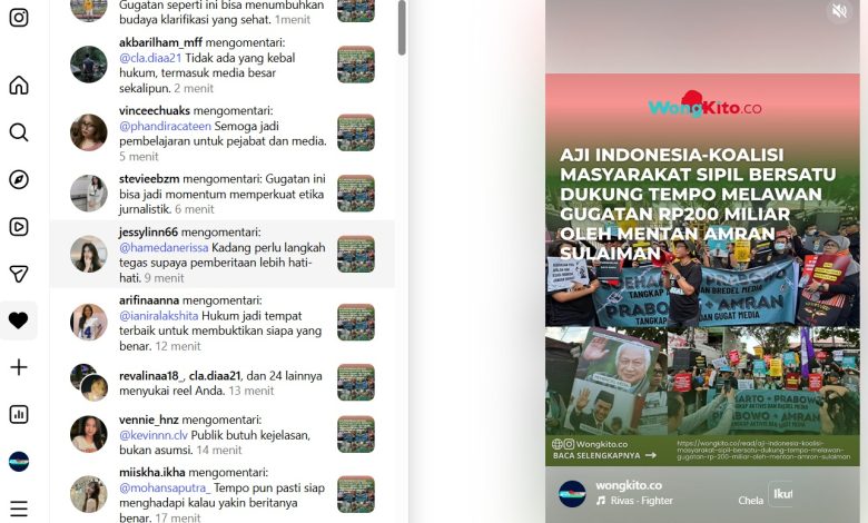 Ratusan komentar buzzer membanjiri salah satu postingan yang berisi visualisasi dari berita wongkito berjudul “AJI Indonesia-Koalisi Masyarakat Sipil Bersatu Dukung Tempo Melawan Gugatan Rp200 Miliar oleh Mentan Amran Sulaiman”.