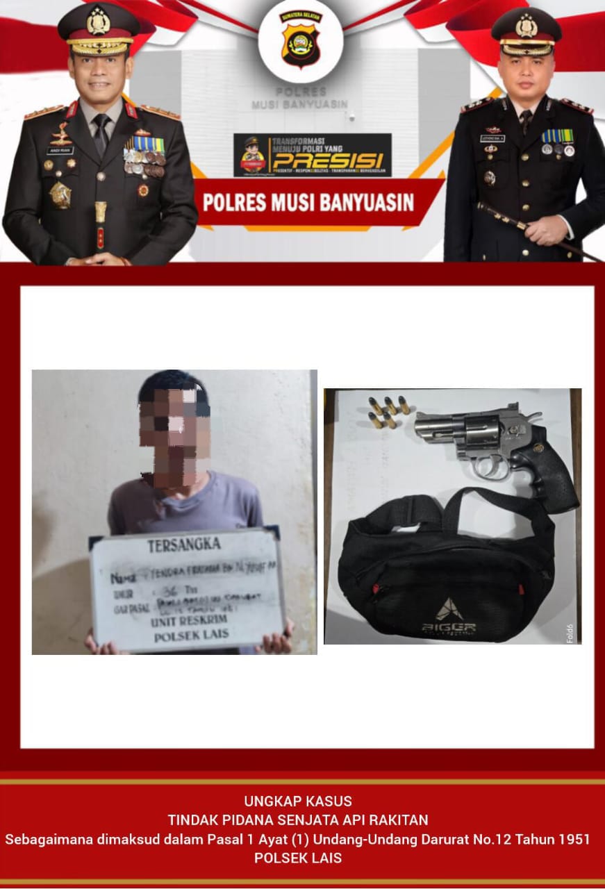 Warga Teluk Kijing III Kecamatan Lais Kabupaten Musi Banyuasin ini ditangkap Aparat Kepolisian Polsek Lais. Lantaran diduga memiliki dan menyimpan senjata api rakitan (senpira ) jenis airsoftgun merk wingun yang telah di modifikasi menjadi senjata api warna Silver bergagang plastik warna hitam.