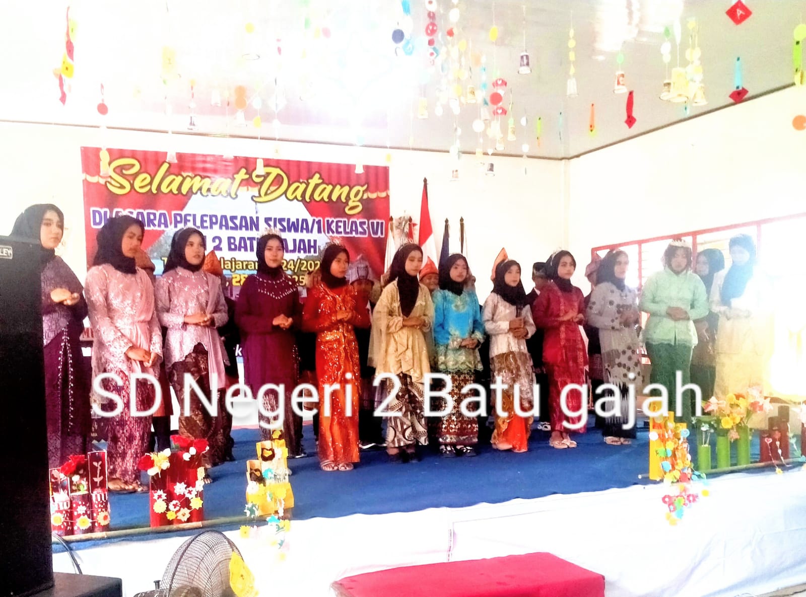 Ucapan resmi pelepasan dan penyerahan kemali siswa-siswi kelas VI kepada orang tuanya diikuti oleh seluru para dewan guru dan dihadiri kepala Desa Batu gajah,Komite sekolah, serta orang tua wali kelas 6 dan disaksikan oleh siswa-siswi yang lain secara langsung di ruangan gedung sekolah SD negeri 2 Batu Gajah.
