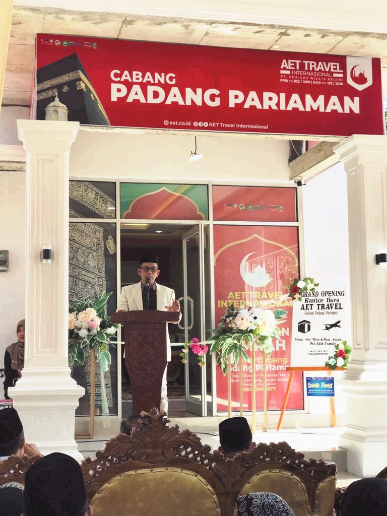 “Pada hari ini kami mengundang Bapak/Ibu semua dalam rangka menghadiri jamuan atau syukuran peresmian Kantor Baru AET Travel Internasional Cabang Padang Pariaman. Semua hal ini kami sadari bahwa kegiatan ini terlaksana semata-mata adalah karena izin, rahmat dan nikmat dari Allah Swt. Semua ini terjadi bukanlah karena kami hebat, Bukan pula karena kami kuat, Akan tetapi semua ini adalah bentuk kebulatan tekad bahwa sejak tahun 2017 kami di amanahi sebagai kepala Cabang AET Travel. Kami telah memadukan niat untuk menjadi jembatan umat ke baitullah yang amanah, terpercaya dan profesional.
