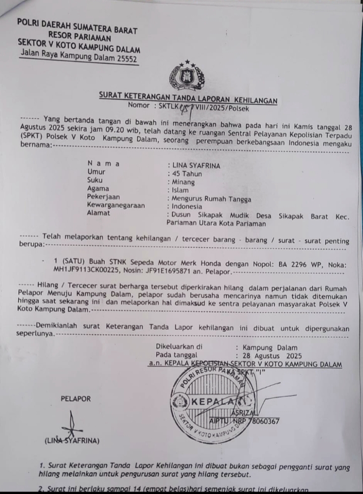 Berita kehilangan : SURAT KETERANGAN TANDA LAPORAN KEHILANGAN Nomor : SKTLK VIII/2025/Polsek