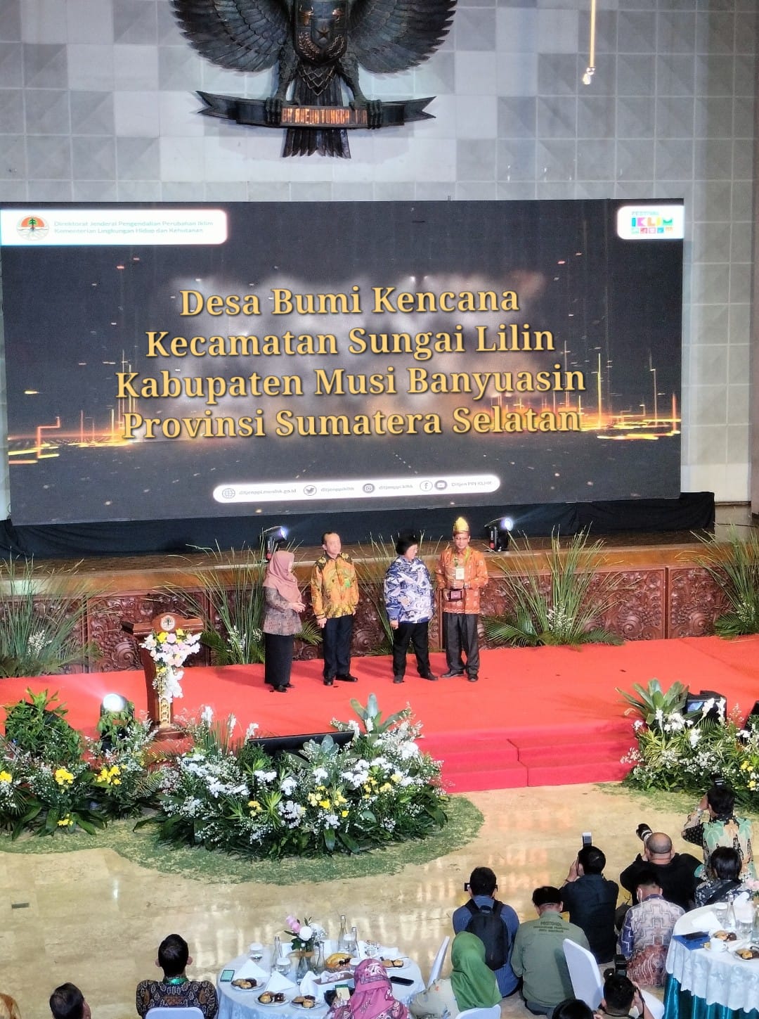 Trophy Proklim Utama tersebut diserahkan secara langsung oleh Menteri Lingkungan Hidup dan Kehutanan, Siti Nurbaya Bakar kepada Kepala Desa Bumi Kencana Kecamatan Sungai Lilin Erwin Aprianto, Selasa (24/10/23) di Gedung Manggala Wanabhakti, Jakarta.