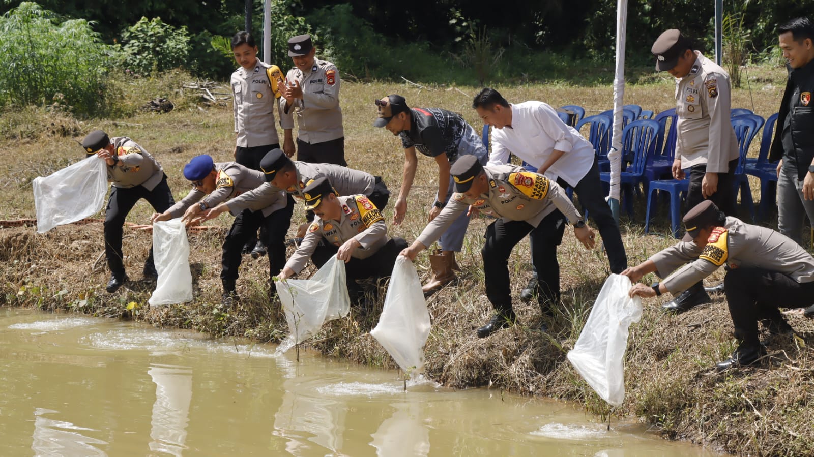 Wakapolres Muba Kompol Iwan Wahyudi SH, Kapolsek Lais AKP Muhammad Ridho Pradani SPd SH,Kasat Pol Air, Kasat Binmas, beserta anggota Saat kegiatan penaburan ribuan bibit ikan, menanam jagung dan Singkong (07/11).