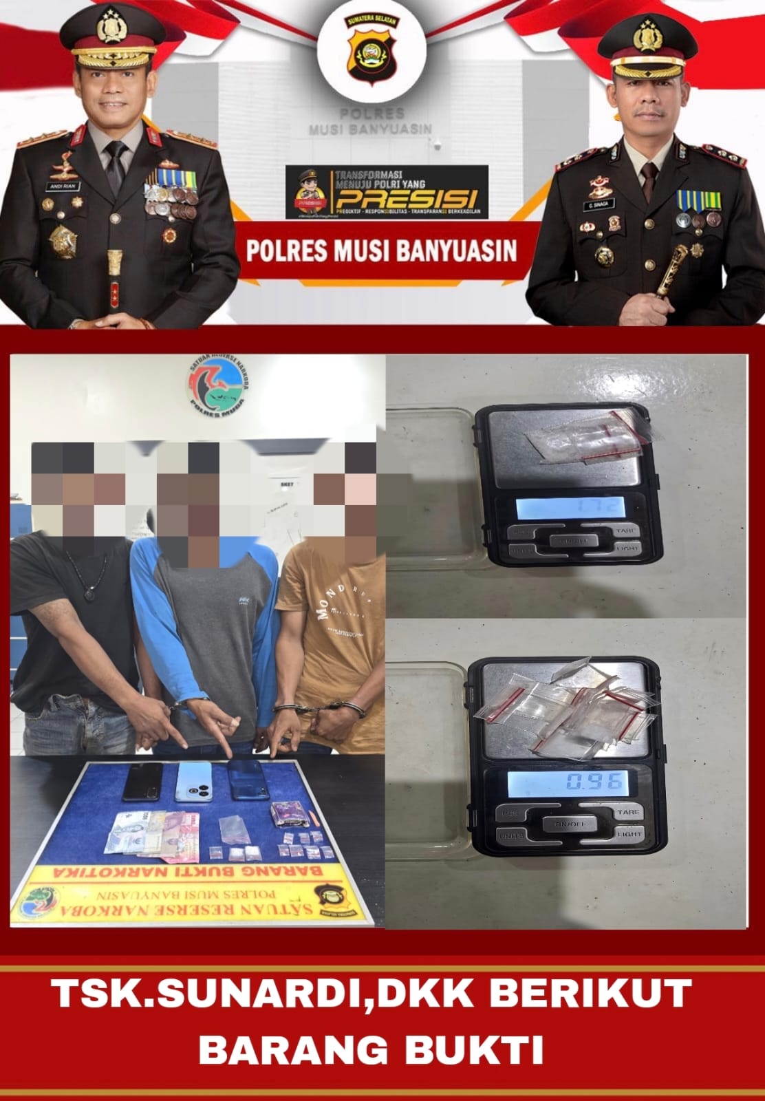 “Saat ini seluruh tersangka dan barang bukti telah diamankan untuk kepentingan penyidikan lebih lanjut. Kami mengajak masyarakat untuk aktif memberikan informasi jika mengetahui adanya peredaran narkoba. Polres Muba berkomitmen tidak memberi ruang bagi pelaku narkotika,” tegas IPTU Budi. (**).