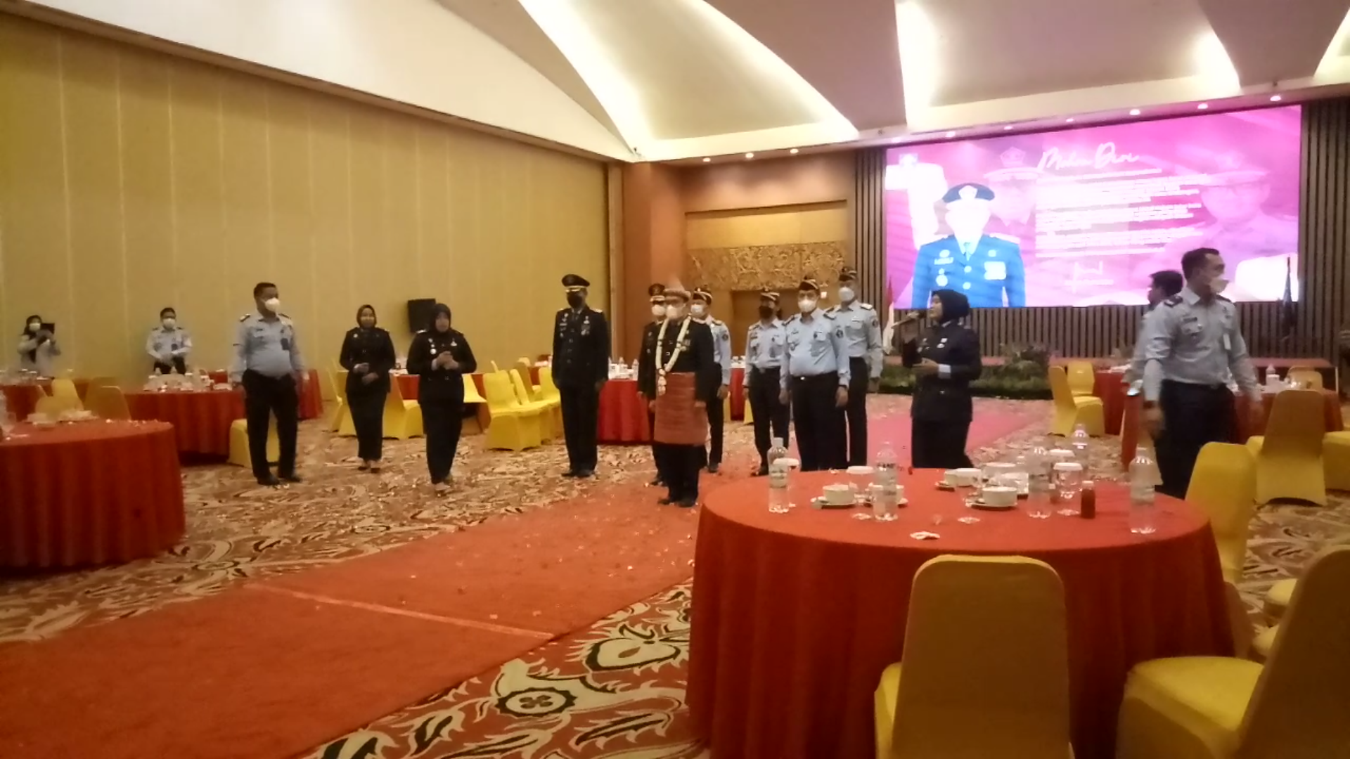 Palembang,The8news.com | Suasana haru mengiringi Pelepasan Purna Bhakti Kepala Kantor Wilayah Kementerian Hukum dan HAM Sumatera Selatan Indro Purwoko, dilaksanakan di Hotel Aryaduta Palembang, Selasa (01/03/2022).