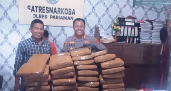 untuk pasal yang di sangkakan yaitu pasal 114 ayat 2 juncto pasal 111 ayat 2 undang-undang nomor 35 tahun 2009 tentang narkotika untuk ancaman hukumannya yaitu 6 tahun dan paling lama itu seumur hidup, ini untuk di wilayah hukum Polres Pariaman ini yang paling besar untuk pengungkapan narkotika jenis ganja sekaligus hadiah HUT Bhayangkara.