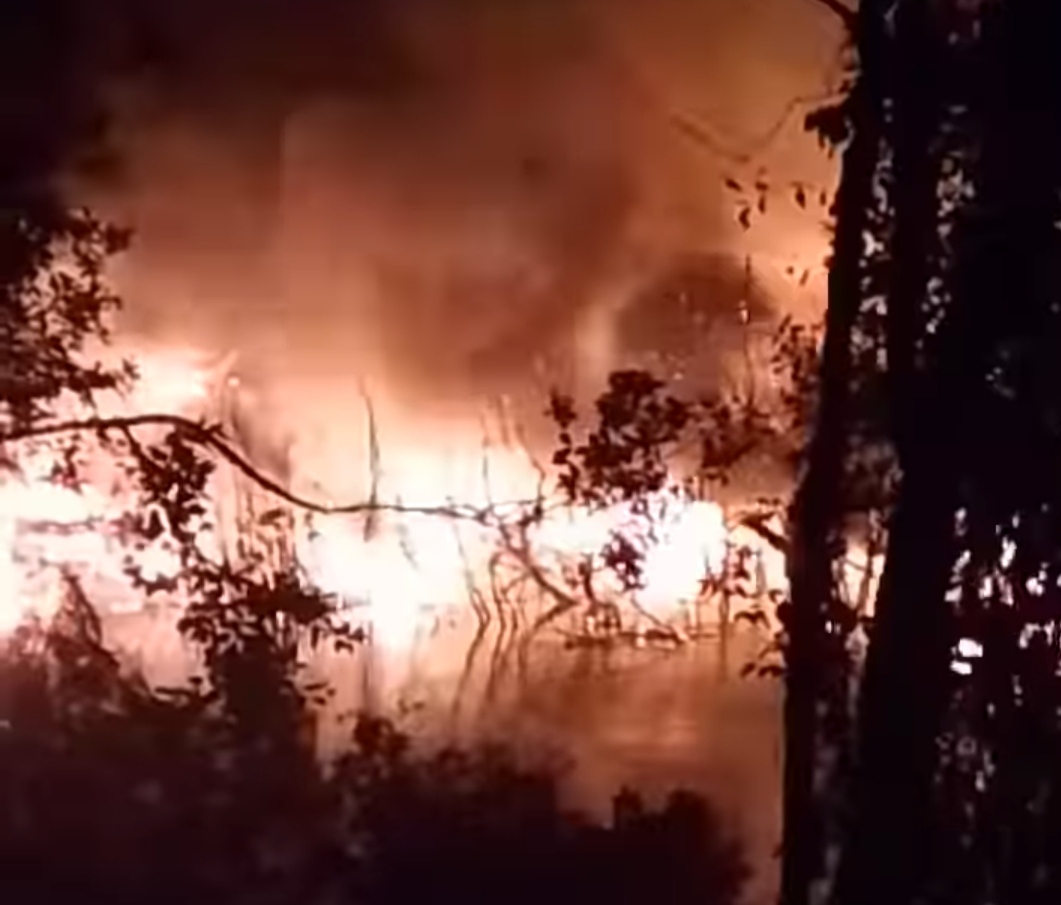 menurut sumber di lapangan terdengar suara ledakan keras yang disertai kobaran api dari lokasi kejadian.