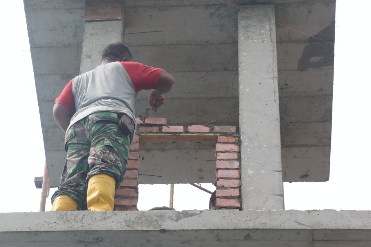 Anggota Satgas TMMD pun terus melakukan pembangunan menara masjid agar bisa selesai tepat waktu.