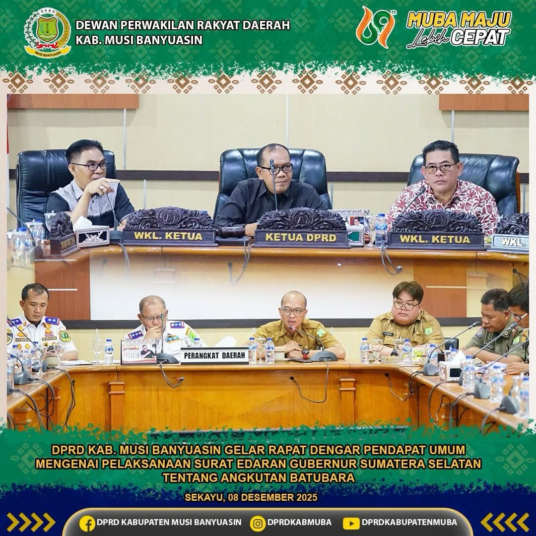 Rapat yang berlangsung di Ruang Rapat Badan Musyawarah DPRD Kabupaten Muba, Senin (8/12/2025). Dipimpin oleh Ketua DPRD Muba Afitni Junaidi Gumay SE dan didampingi oleh Wakil Ketua I DPRD, Irwin Zulyani, dan Wakil Ketua II DPRD, H. Ahmadi. Juga dihadiri Bupati Muba H.M. Toha Tohet, S.H melalui Asisten Bidang Perekonomian dan Pembangunan Setda Muba Alva Elan SST MPSDA, Kepala Dinas Perhubungan Muba Musni Wijaya SSos MSi serta Bagian Hukum Setda Muba.