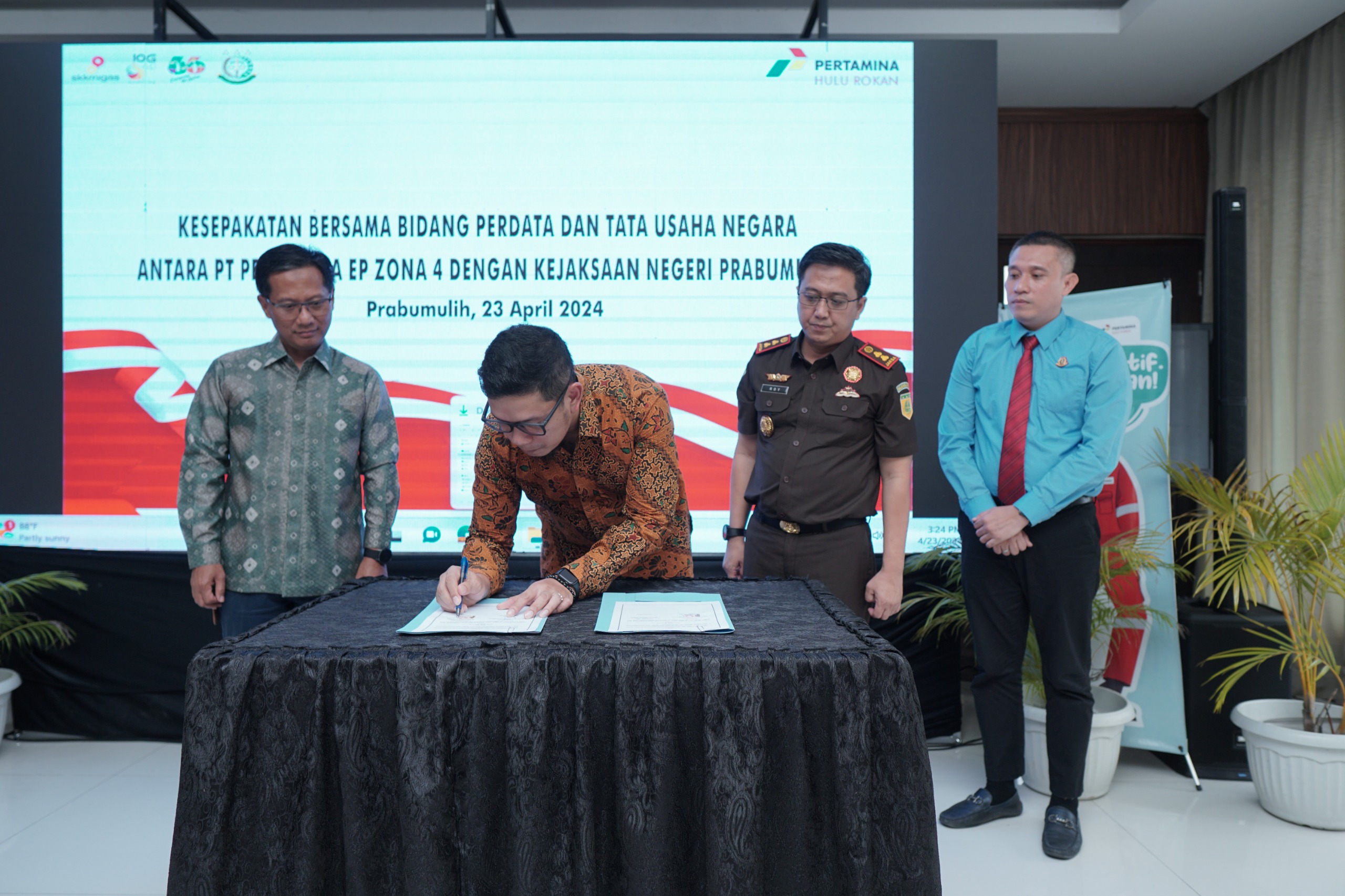 MOU Kerjasama Bidang Perdata dan Tata Usaha Negara ini ditandatangani oleh General Manager PEP Zona 4, Djudjuwanto dan Kepala Kejaksaan Negeri Prabumulih Roy Riyadi SH.MH, di Gedung Wisma Akhlak, Komperta Prabumulih, selasa (24/4).