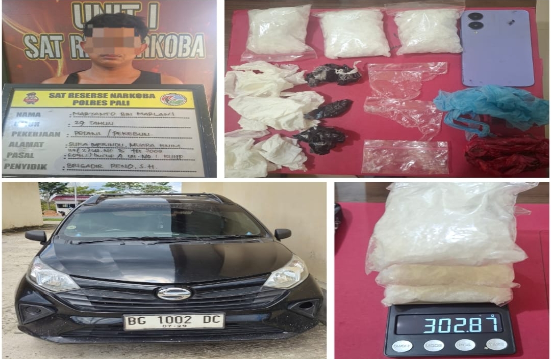 PALI, the8news.com — Polda Sumatera Selatan melalui jajaran Polres Penukal Abab Lematang Ilir kembali menunjukkan ketegasannya dalam memberantas peredaran gelap narkotika. Personel Satres narkoba Polres PALI berhasil menggagalkan upaya peredaran sabu dalam jumlah besar dengan menangkap seorang kurir lintas kabupaten berinisial M (29) beserta barang bukti seberat bruto 302,87 gram.