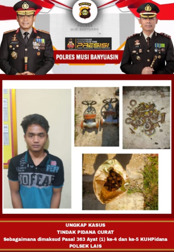 MUBA, The8news.com – Aksi pencurian serta pemberatan (Curat) terjadi di wilayah Kabupaten Muba. Kali ini, komponen industri milik PT Medco Energi menjadi sasaran. Seorang tersangka bernama Alek (20) warga Desa Babat Banyuasin, Kecamatan Babat Supat, berhasil diamankan Polsek Lais atas dugaan pencurian yang terjadi pada Jumat, (20/06/24) sore di Cluster M PT Medco Energi, Desa Lais Utara, Kecamatan Lais.