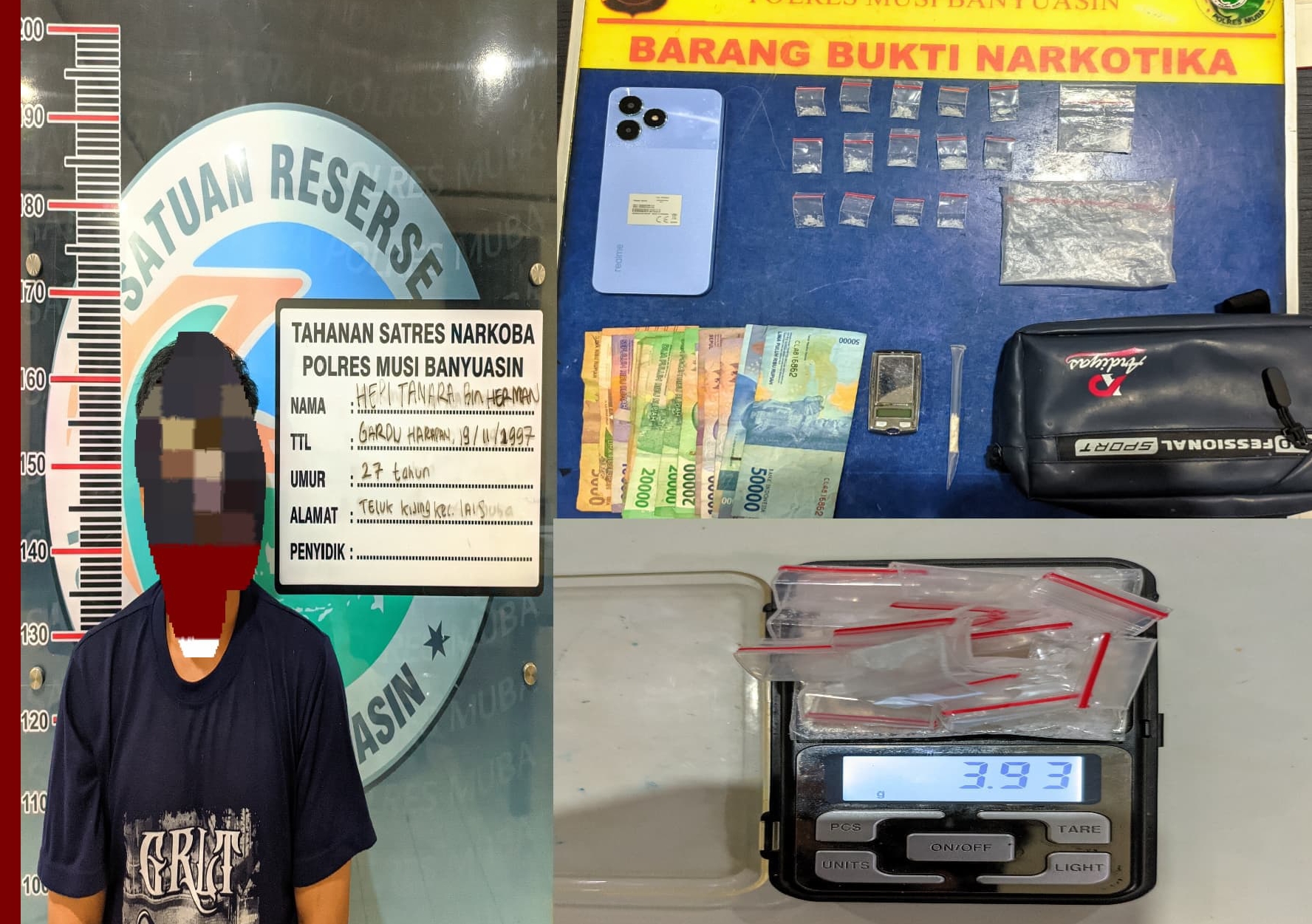 Gerak cepat langsung dilakukan polisi yang dipimpin langsung kanit Reskrim Polsek Lais Ipda Zulpikri, SH bersama personil dan alhasil dari hasil Penggeledahan didapat 15 (lima belas) paket yang diduga narkotika jenis shabu dengan berat bruto 3,93 (Tiga koma sembilan tiga) gram, 1 (Satu) buah plastik klip bening, Uang tunai sebesar Rp.320.000,- (tiga ratus dua puluh ribu rupiah), 1 (satu) unit timbangan digital, 1 (satu) buah skop plastik, 1 (satu) buah tas selendang warna biru, 1 (satu) unit handphone REALME NOTE 50.