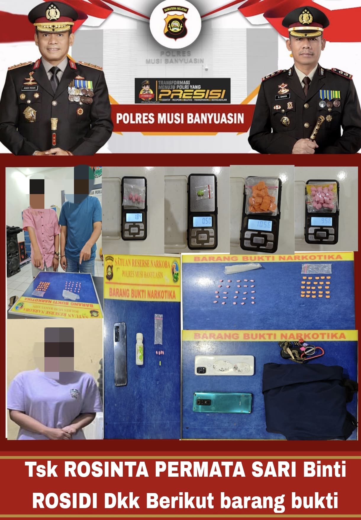 Kapolres Muba AKBP God Parlasro Sinaga, SH, SIK, MH melalui Kasat Narkoba IPTU Budi Mulya, SH, MH mengungkapkan bahwa dua tersangka yang berhasil diamankan adalah RD (38), warga Desa Sri Gunung, dan RG (30), warga Desa Linggo Sari. Keduanya diketahui berprofesi sebagai wiraswasta.
