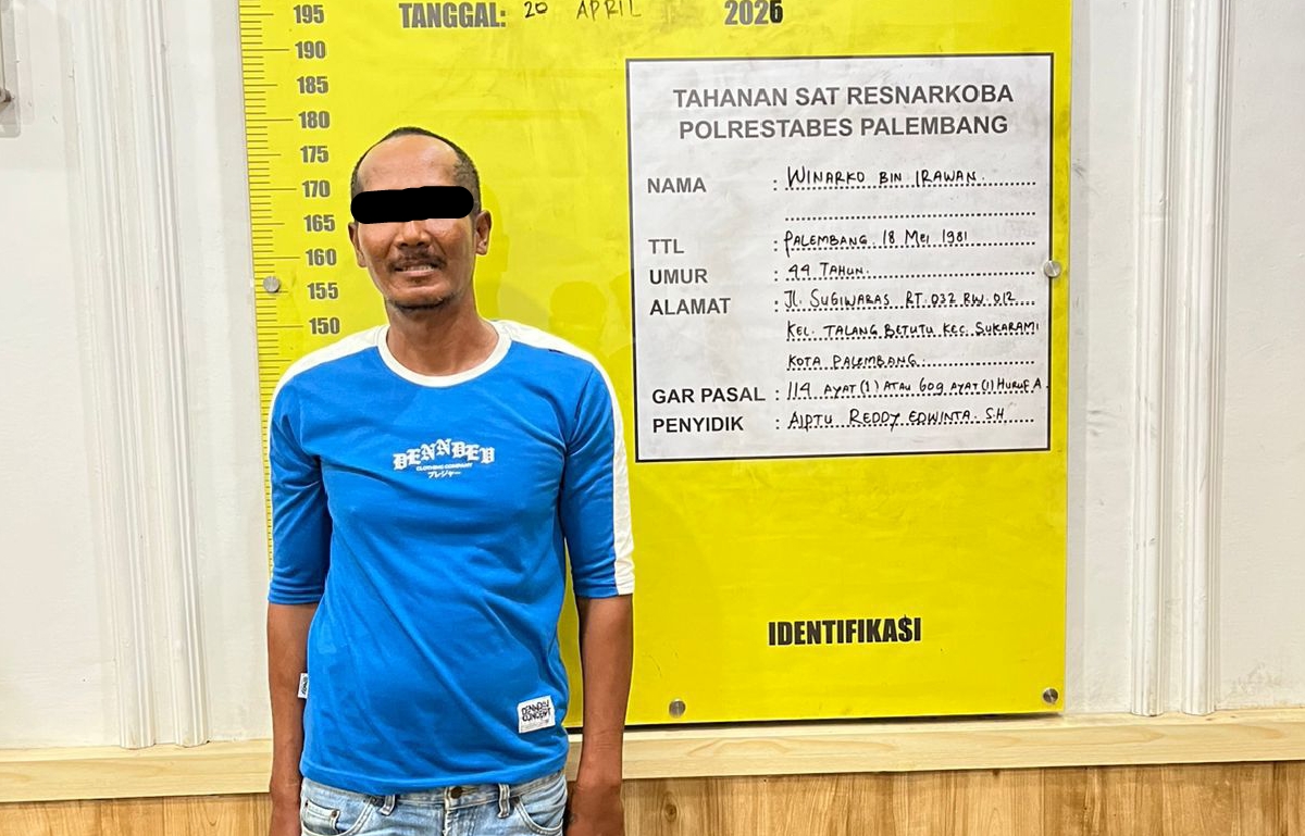 PALEMBANG,the8news.com — Polda Sumatera Selatan melalui Satres narkoba Polrestabes Palembang kembali menunjukkan komitmen tegas dalam memberantas peredaran gelap narkotika di wilayah hukumnya. Seorang pria berinisial W (44) berhasil diamankan di kawasan Jalan Sugiwaras, Kelurahan Talang Betutu, Kecamatan Sukarami, Kota Palembang, pada Senin, 20 April 2026.