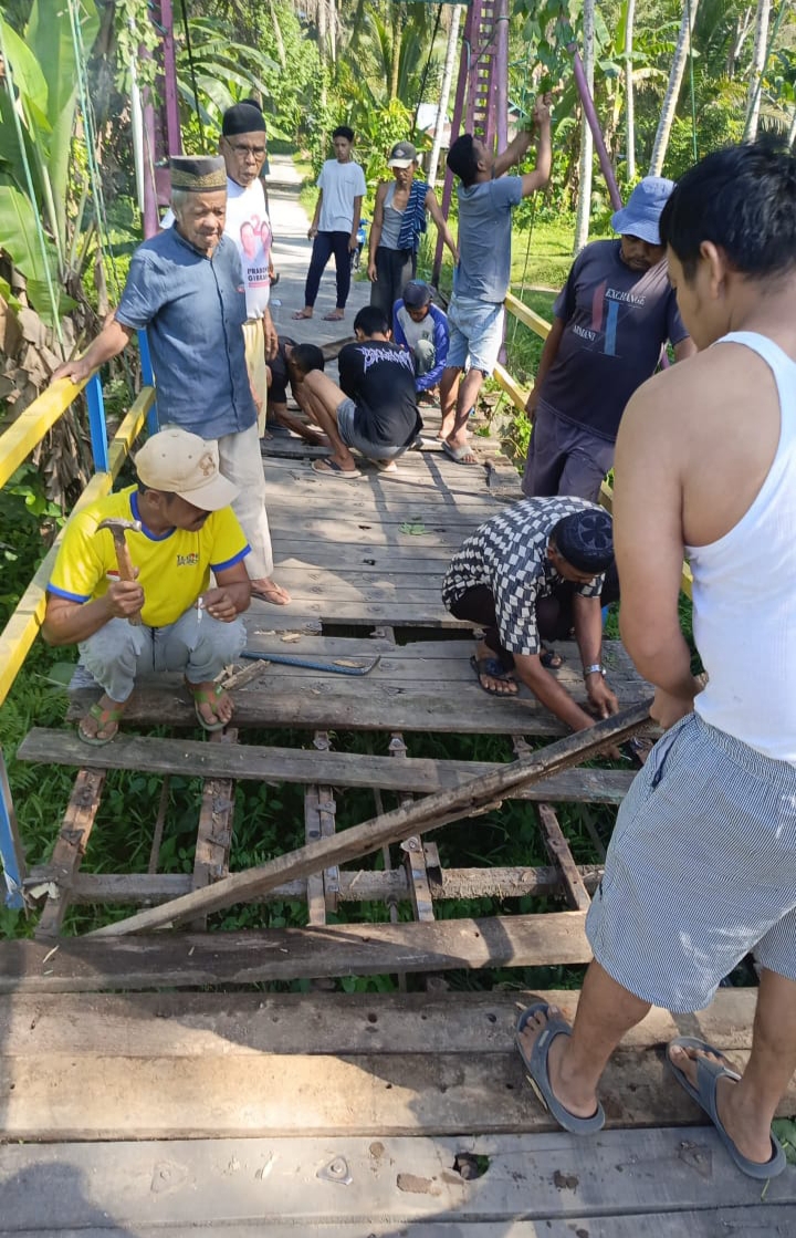 Dengan alat dan bahan sederhana, warga memperbaiki bagian jembatan yang rusak demi kelancaran akses dan keamanan. Aksi gotong royong ini menjadi wujud nyata kepedulian dan kekompakan masyarakat dalam menghadapi keterbatasan.