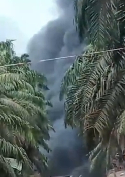Terpantau di video yang di sorot warga asap hitam pekat melambung tinggi di udara , di area kebun sawit.